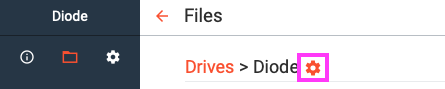 In order to modify your system’s File Sync Setting, go to the Drive you’d like to adjust (click the folder icon in the quick access bar twice and the click the Drive) and the click the gear icon in the File/Folder breadcrumb (to the right of the Drive name):