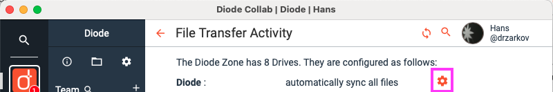 That will open the File Transfer Activity window - at the top, it lists all Drives’ sync settings there. Clicking the gear icon by the Drive will take you directly to the sync setting.